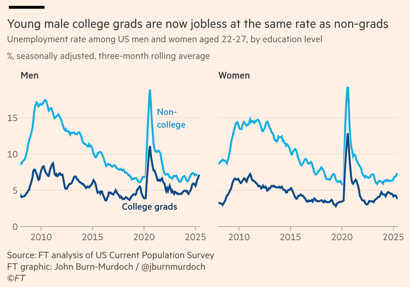 At time of Ygelsasis’s writing, the unemployment rate for college graduated young men and non college grades are at the same, alongside the fact that post 2008. Men saw persistently higher unemployment rates than women. On top of that, learn to plumb is a dismal failure as blue collar job market collapse.