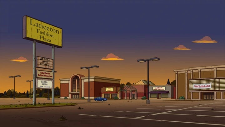 The fast version is Pittsburgh Mills, in Frazer, Pennsylvania. One analysis documents assessed value falling from $148 million in 2018 to under $15 million by 2024. A 90% collapse of a local property tax base, from a single asset, in six years. Each dying lower-tier American mall also removes something in the range of $1.8 to $3 million in annual sales tax revenue from its host municipality. For some cities where one mall represents 20 to 30% of the local tax revenue. This is not a rounding error, and it’s clear that malls and downtowns are slow motion fiscal emergencies.
